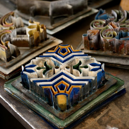 After pressing, the tiles are removed from the mold and placed on a rack until they harden enough to be moved into a tank of water.