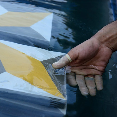 The tiles are cured in water for several days, and not touched, during which they undergo a hydrolysis process and harden into strong concrete.