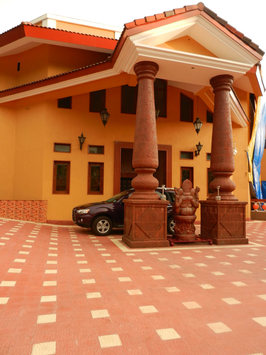 Crocodile pattern tiles used in the driveway of Dame Indira Patel's home in Goa.