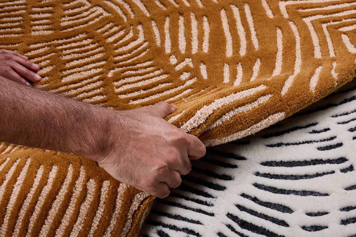 The rugs are made from the most loved material - New Zealand wool and Jasmine Silk which makes the rugs extra special. Our rugs are hand-tufted by artisans from traditional backgrounds whose families are still carrying forward the legacy. The material and the techniques lend a soft, natural touch, making it one of the most enjoyable rugs to walk on. The journey of a rug begins much more before a thread, it starts with an idea by the creator and then what material will be suitable for the design. The design of TARU is inspired by living things and organic forms, each rug has its own story, pattern, density, and flow, showcasing the beauty of imperfections of a hand-drawn line by nature. These lines don't start or end anywhere but just continue across the rugs, imprinting their way through a self-renewing process - resulting in an endless continuity.Wool, Jasmin Silk, Silk Rayon